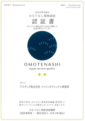 アスザック株式会社ファインセラミックス事業部は、経済産業省創設 おもてなし規格認証 紺認証の事業者に登録されました。