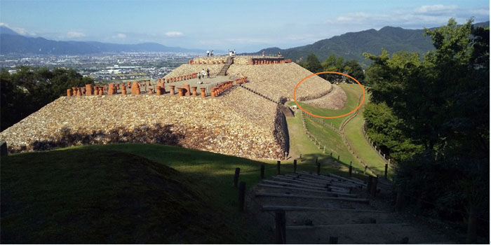 そこで、後円部裾下の三方に石を積むことで前方後円墳の形になるように工夫してあります。