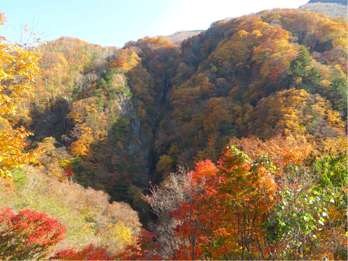 奥に細く流れているのが滝ですが、周りは綺麗な紅葉に囲まれていて、この時期は紅葉狩りの観光客がたくさんいました。
