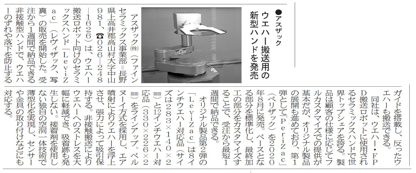 また、弊社の新しい搬送ハンドLeviZac™ が『電子デバイス産業新聞』(2021年1月28日付)に掲載されましたので、その記事もご紹介いたします。